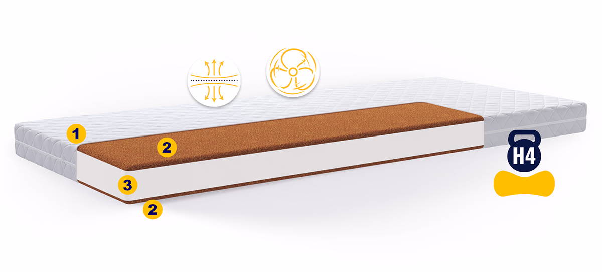 Mata kokosowa usztywnia materac, zapewniając stabilne i równe podłoże do snu, a jednocześnie umożliwia swobodny przepływ powietrza – skutecznie odprowadza wilgoć i zapobiega powstawaniu pleśni, roztoczy i innych alergenów. Jest materiałem antyalergicznym i odpornym na odkształcenia. Pianka poliuretanowa dodaje elastyczności, dopasowuje się do ciała dziecka i zwiększa komfort codziennego użytkowania. Dzięki temu materac jest przewiewny, trwały i higieniczny.